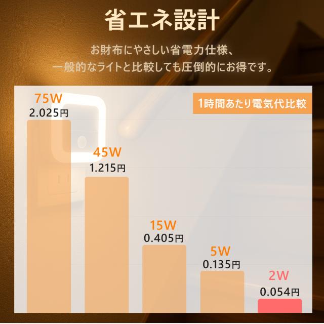 毎日使うものだからこそ、省エネにもこだわりました。消費電力はわずか2.5W、光が必要なときにだけ点灯し、無駄な電力をカット。小さなことですが、毎日の快適さに大きくつながります。