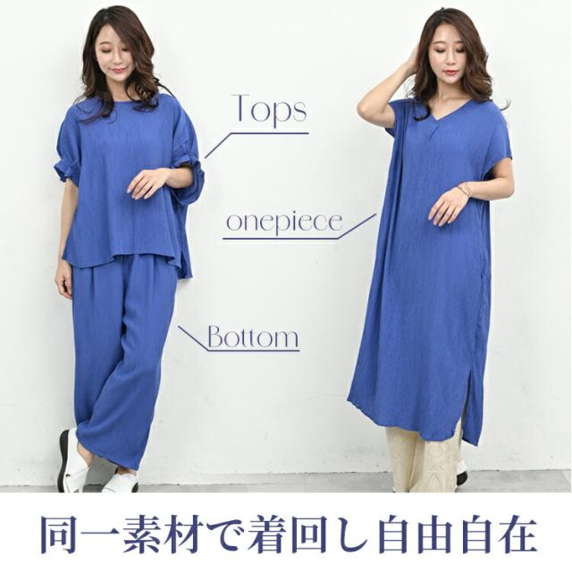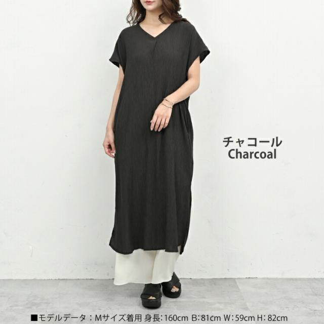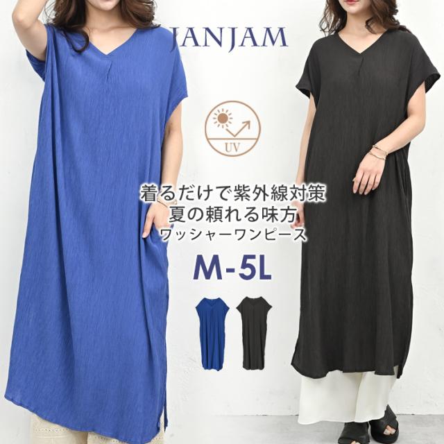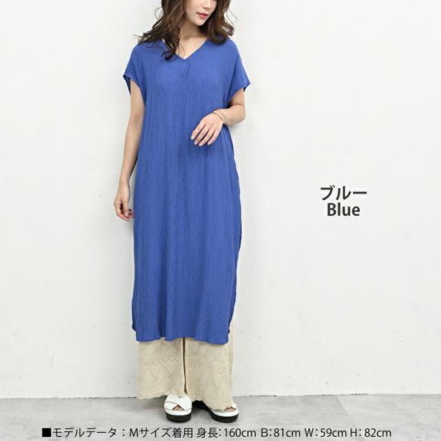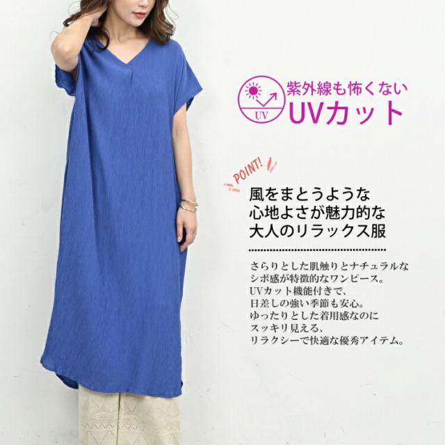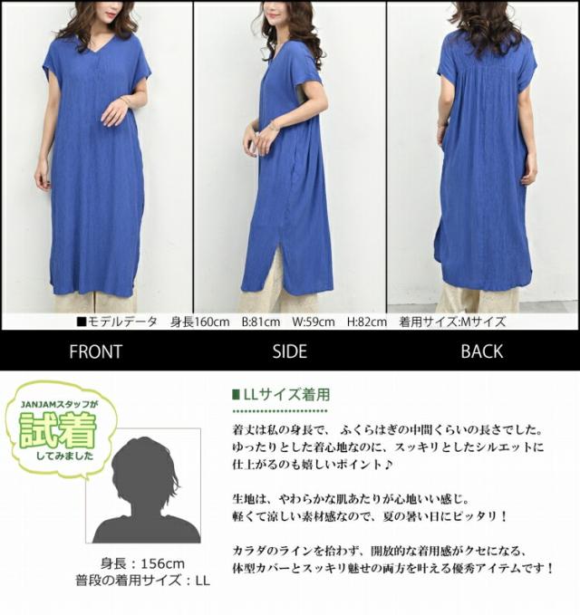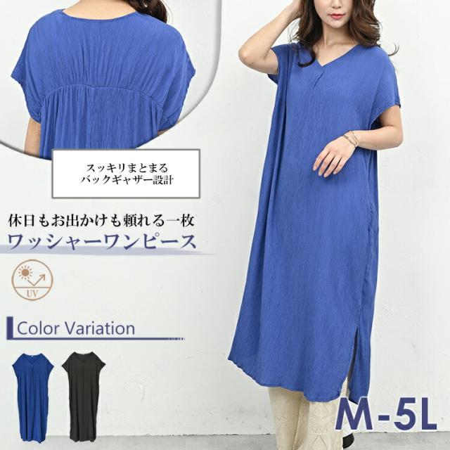 大きいサイズ レディース バックギャザーワンピース メール便対応 半袖 ロング丈 Vネック ワッシャー素材 サイドスリット UVカット UVSS M/LL/3L/4L/5L ゆったりサイズ ぽっちゃり女子 プラスサイズ