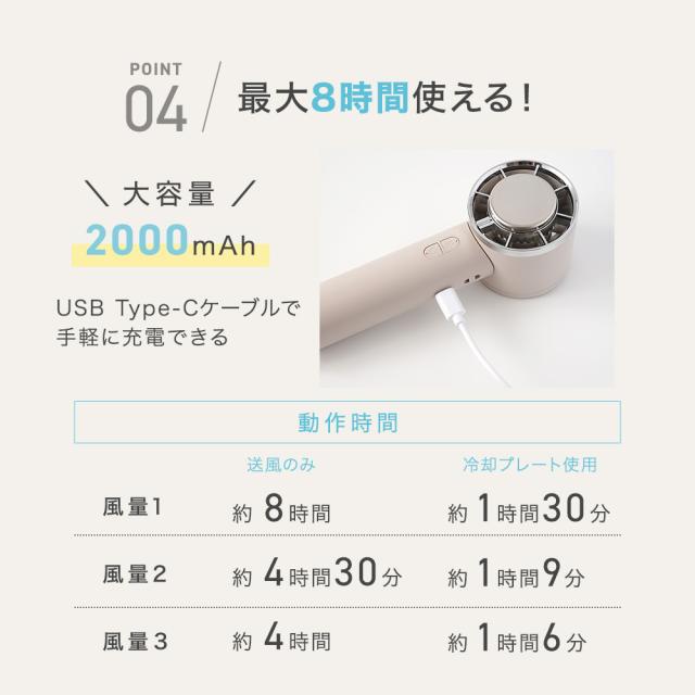 | 動作時間 | 【送風のみ】約 4〜8時間 【冷却プレート使用】約 1時間6分〜1時間30分 |