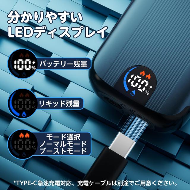 【分かりやすいLED液晶】 ・ バッテリーやリキッドの残量が一目でわかり、充電のタイミングや、あとどのくらい吸えるのかを数値や点灯数でわかりやすく表示。 ※TYPE-C急速充電対応、充電ケーブルは別途でご用意ください。 |