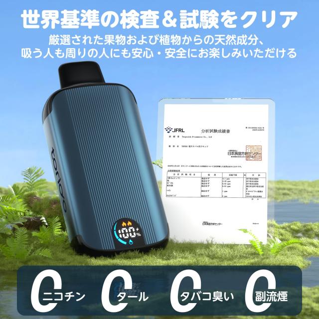 【安心・安全】 ・TORIDO電子タバコに使われたリキッドは全て天然素材を使用し、独自の製法で仕上げたもの、日本食品分析センターにて認定済み。 ・ニコチン・タールゼロ、タバコ臭いなし、甘いフレーバーのカロリーや糖質もゼロ、ご本人・周りの方・環境にも優しい電子タバコです。 |