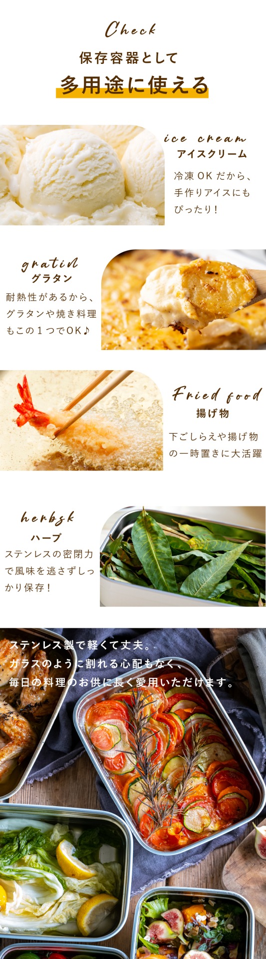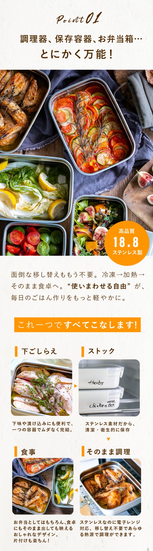 ・冷凍・冷蔵・常温保存OK ・調理〜そのまま食卓まで使えてサステナブル ・軽量設計でアウトドアにも◎ | |