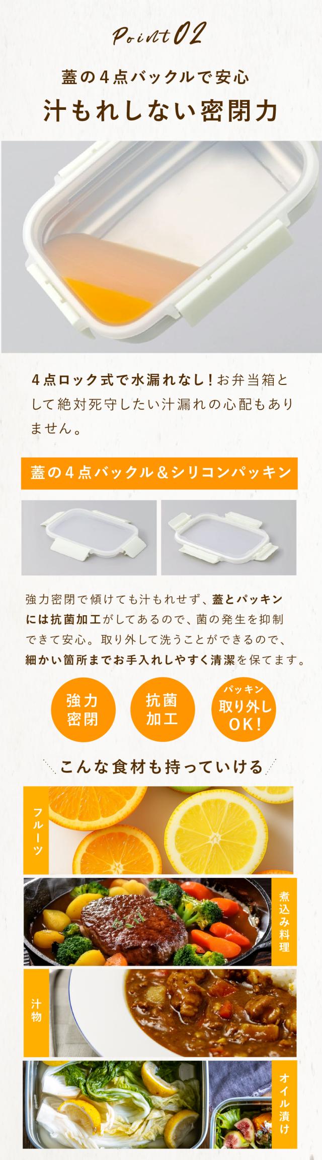 蓋は4点ロック+2層パッキン構造で汁漏れをしっかり防止。 しかも抗菌仕様で、衛生的。ニオイや色移りも起こりにくい設計です。