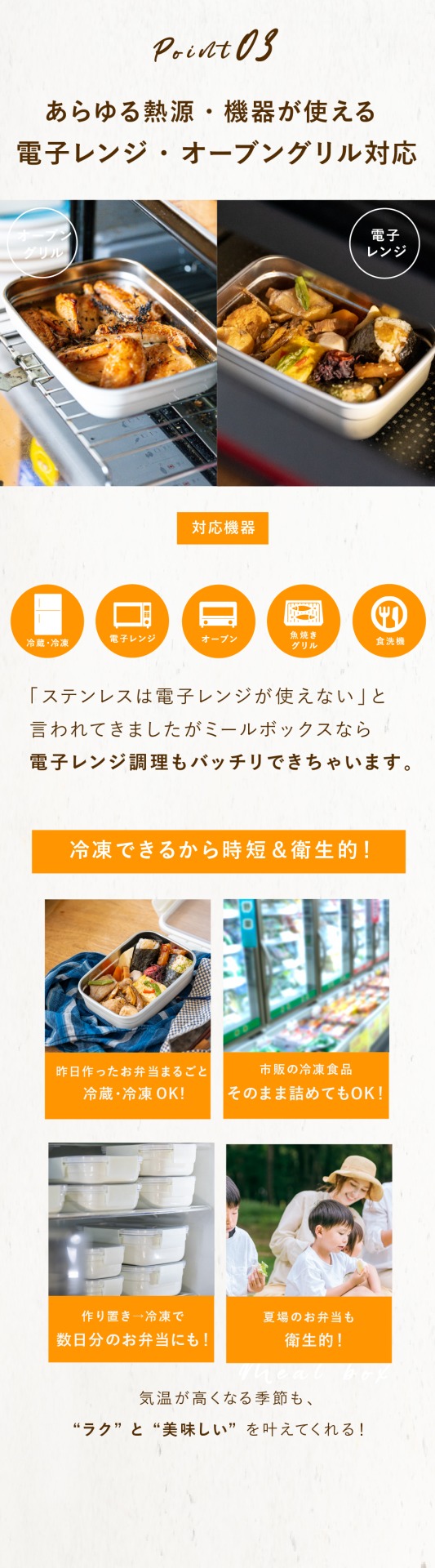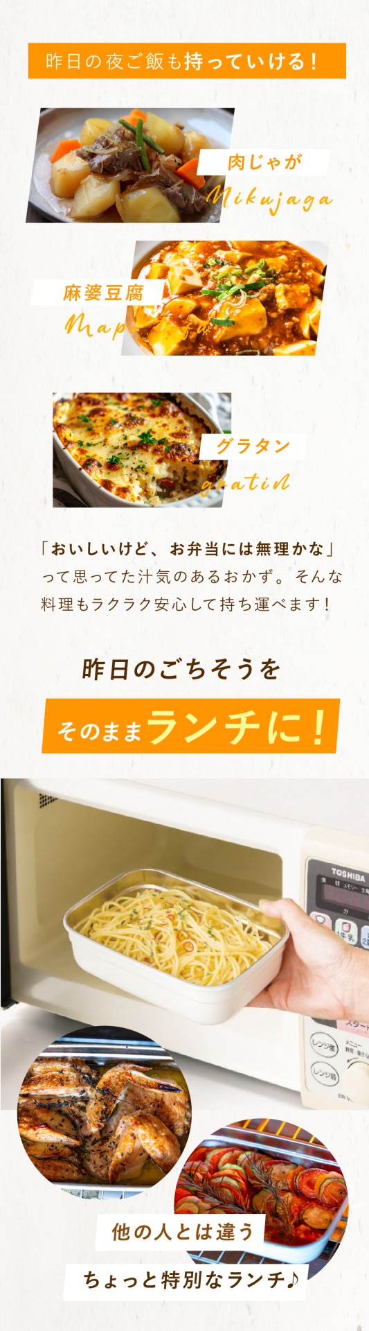 ステンレス製なのに、加熱OK。蓋を外せば電子レンジ・オーブン・グリルで温められます。 朝に詰めたお弁当も、お昼にそのまま温かく食べられます。
