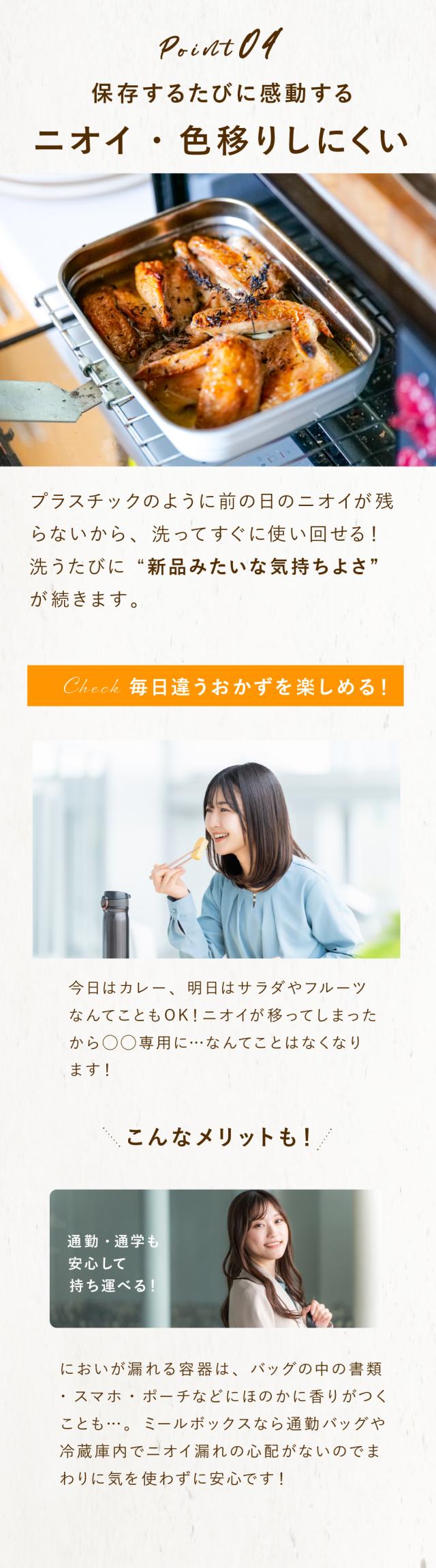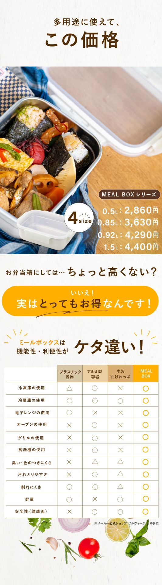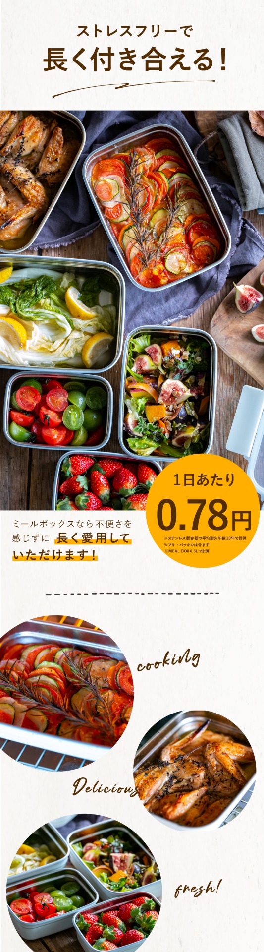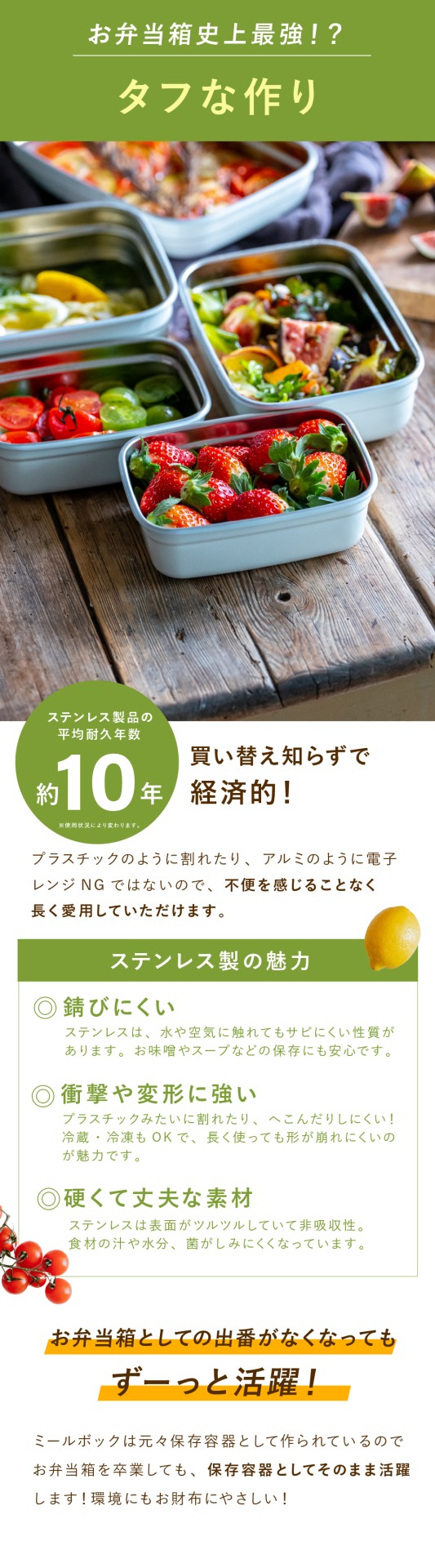 ミールボックは元々保存容器として作られているのでお弁当箱を卒業しても、保存容器としてそのまま活躍します!一時的なものではなく「暮らしに残る容器」環境にもお財布にやさしい!