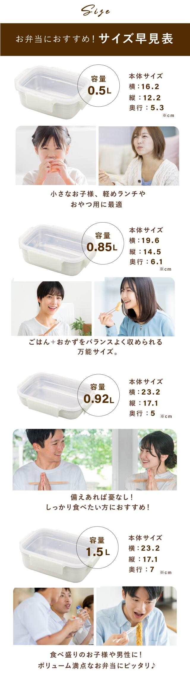0.5L:16.2×12.2×5.3cm 0.85L:19.6×14.5×6.1cm 0.92L:23.2×17.1×5.0cm 1.5L:23.2×17.1×7.0cm | |