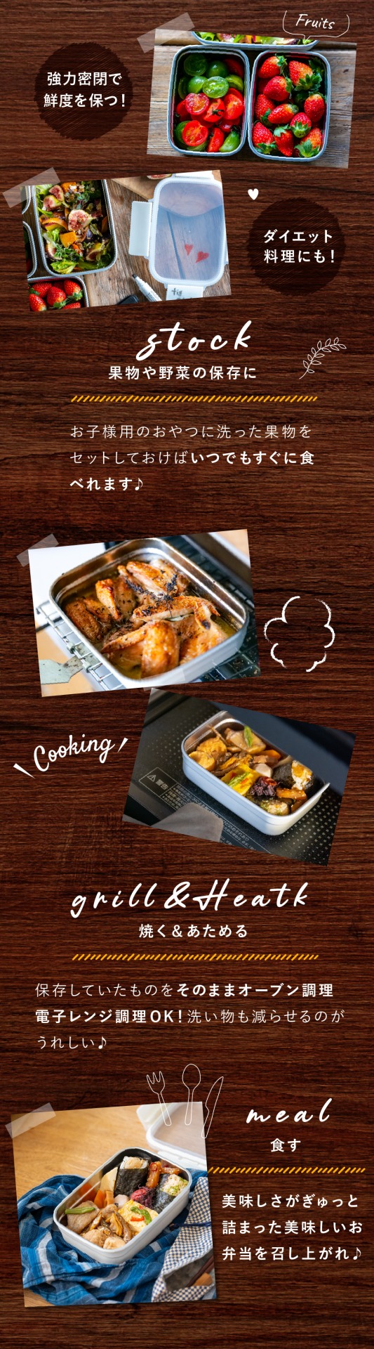 作り置きを詰めてそのまま冷蔵庫で保存、ランチタイムには蓋を外してレンジで温め。 外でも家でも、1日を通して活躍する、新しいスタイルのお弁当箱です。