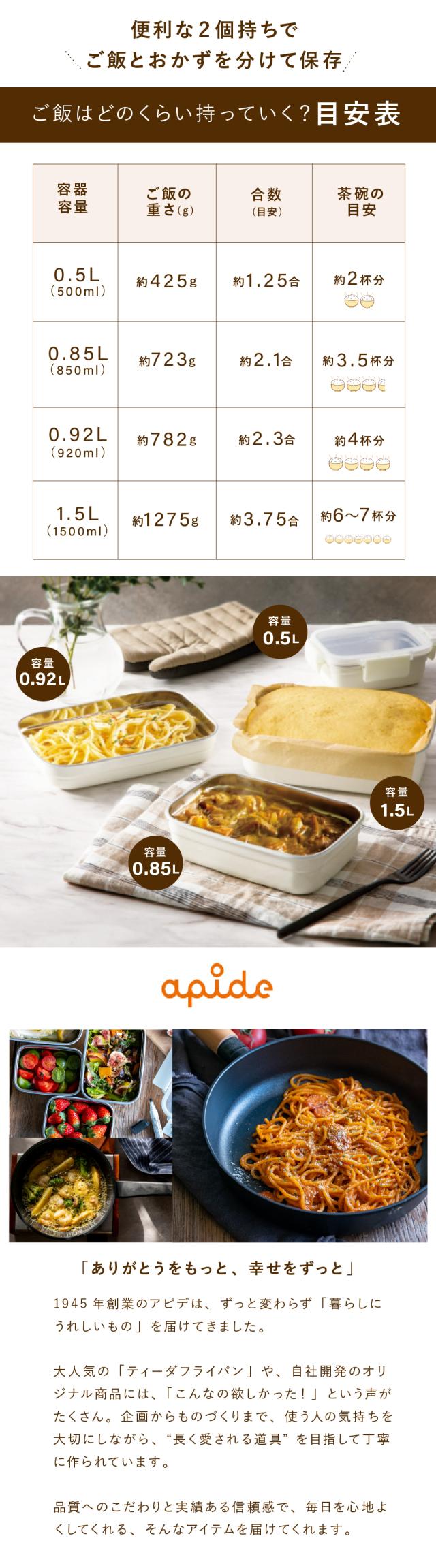 ・電子レンジ・オーブングリル・食器洗浄機対応(※蓋は外して加熱) ・4点ロック構造&2層シリコンで水漏れ防止 ・抗菌仕様の蓋&パッキンで臭いや色移りしにくい ・セラミック塗装で冷蔵庫内が美しく整理可能 ・本体・蓋ともに1年保証付き ・軽量かつ割れにくく、テイクアウト容器としても◎ | |