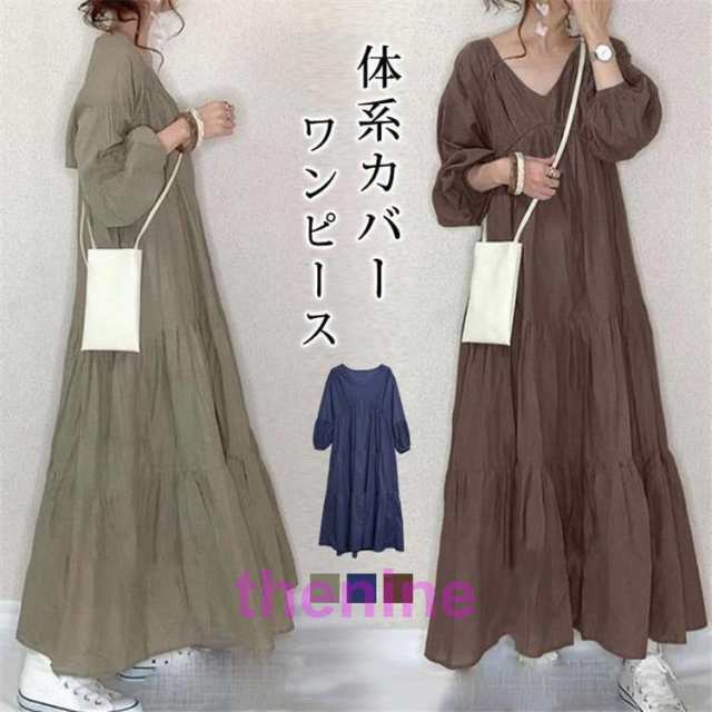 ワンピース レディース 秋 冬 秋冬 長袖 7分袖 マキシワンピース ロング ゆったり シャツワンピ 体型カバー フレア ブラウン カーキ ネイビー