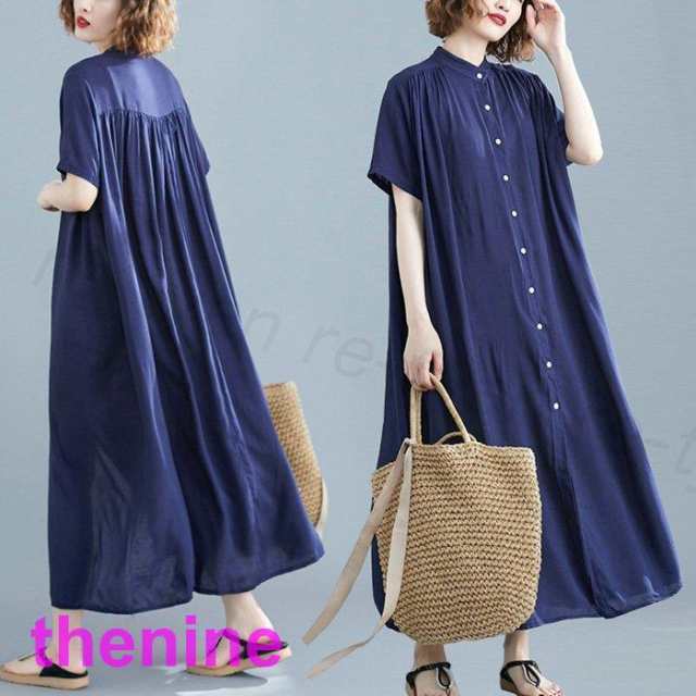 シャツワンピース レディース チュニック ロングワンピース 半袖無地 体型カバー ゆったり春夏 マキシ丈 前開き 前ボタン 大人カジュアル 2WAYカジュアル大きい