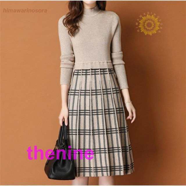 ニットワンピース バイカラーワンピース 長袖 体型カバー レディース 膝丈 着痩せ ひざ丈 チェック ハイウエスト 大きいサイズ ハイネック 秋 冬 30代 40代 50代