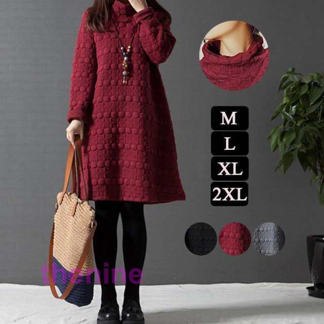 ワンピース レディース チュニック ハイネック 無地 40代 チュニック 冬 防寒 Aライン 長袖 ハイネック 体型カバー 膝丈 ひざ丈ワンピース 赤 黒 灰 ゆったり