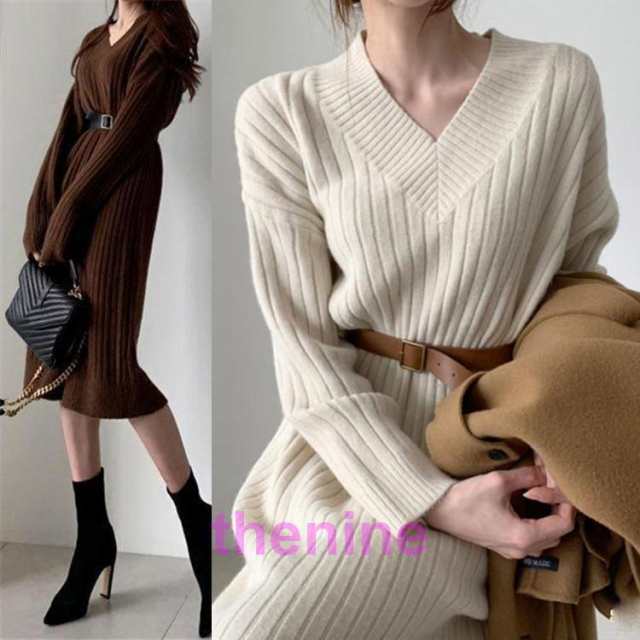 ニットワンピ Vネック ワンピース ゆったり レディース ニットワンピース ロングワンピ ニット 秋 Vネックニットワンピ 冬 長袖ワンピース
