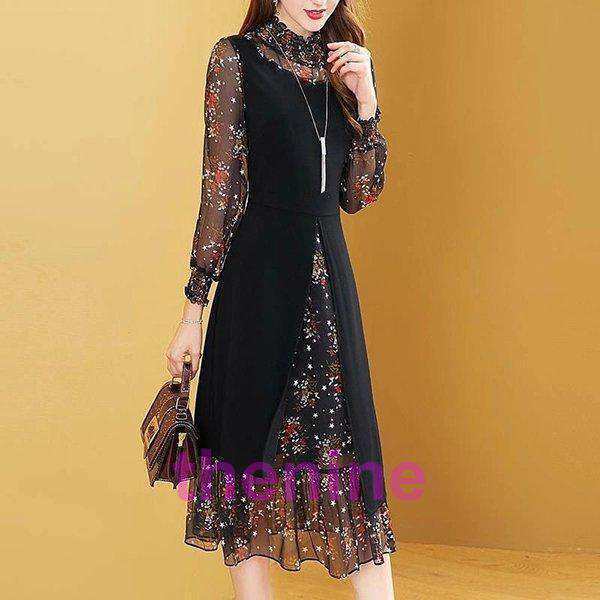 ワンピース レディース 40代 20代 春秋 長袖 きれいめ 上品 シフォンワンピース ロング丈 花柄 大きいサイズ パーティードレス おしゃれ 韓国風 着痩せ OL 新品