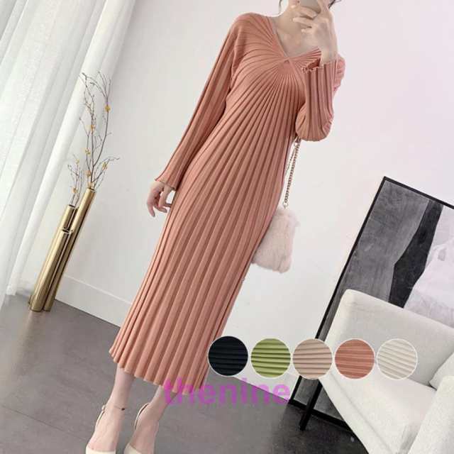 Vネック ワンピース レディース ニットワンピース 秋冬 長袖リブニット ミモレワンピ 膝丈下 フェミニン きれいめ