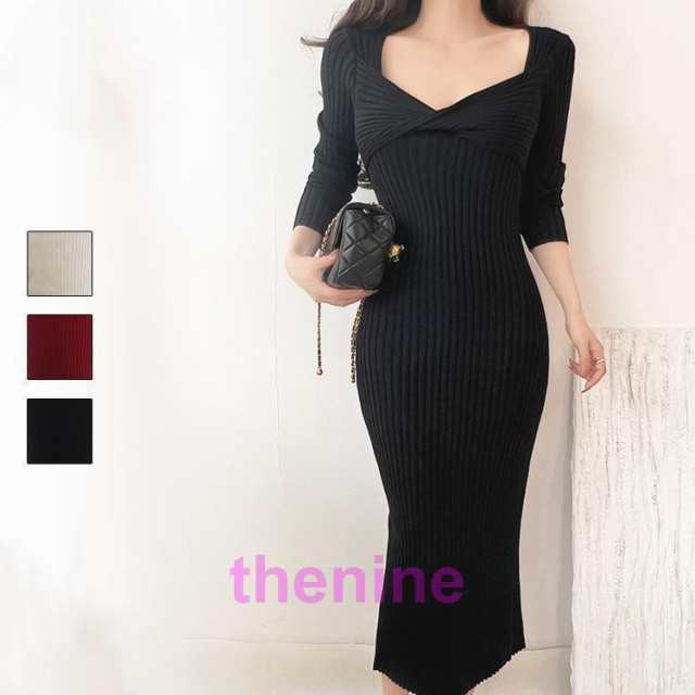 アウトレット ニット ワンピース フロントツイスト リブニット 黒 赤 無地 長袖 タイトライン タイト ロングニットワンピース ミモレ丈 きれいめ
