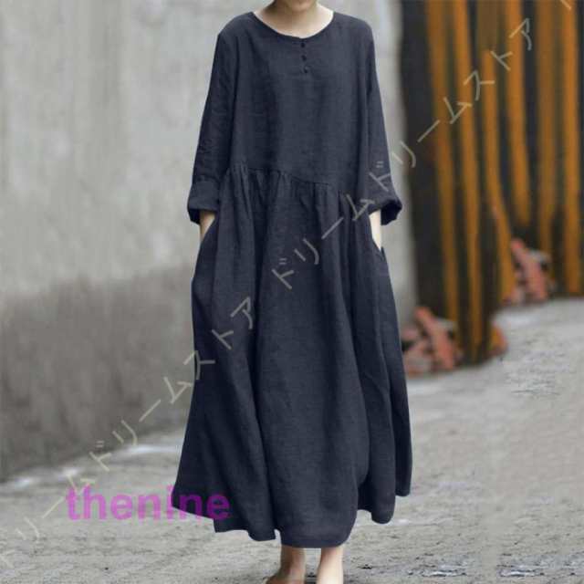 ワンピース ドレス シンプル ワンピース ロング 綿麻混 無地 レディース 長袖 大きいサイズ 体型カバー Aライン 春 秋 冬 20代 30代 40代 50代 60代 お呼ばれ