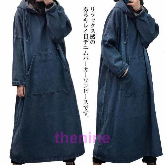 ワンピースレディースデニムワンピパーカーワンピースマキシワンピー長袖ロングワンピースプルオーバーマキシ丈Aラインワンピース