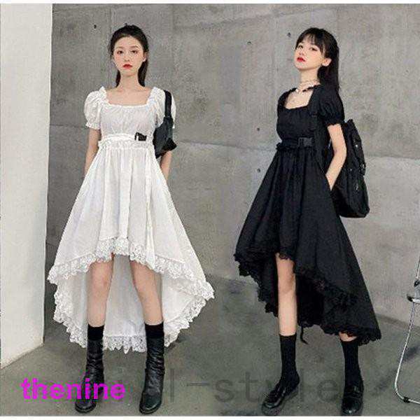 フィッシュテールワンピースレースフリル韓国オルチャンストリート原宿系半袖スクエアネックガチャベルト変形アシメ
