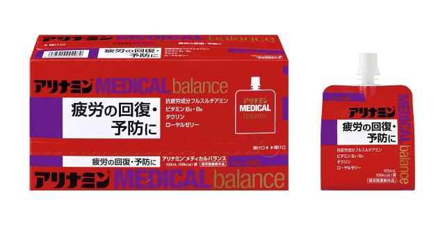 疲労の回復・予防の効能を持ったアリナミンのパウチドリンク。抗疲労成分フルスルチアミンに加え、ビタミンB2・B6、タウリン、ローヤルゼリーを配合。