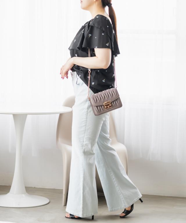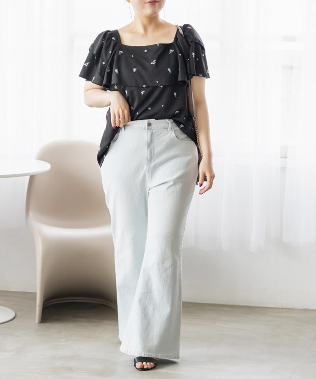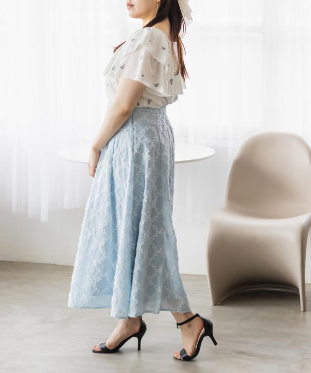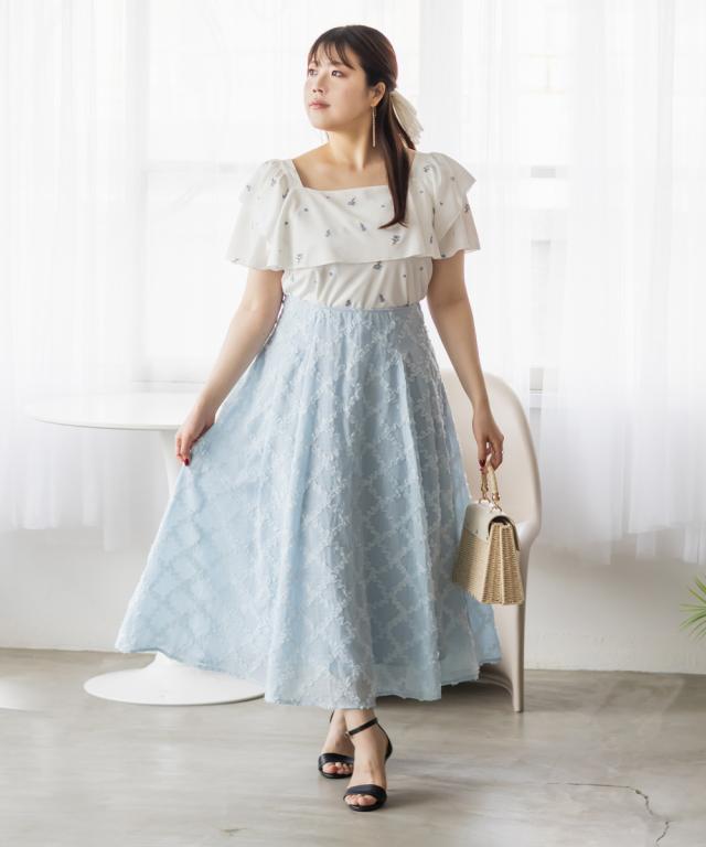 | 3Lサイズを着用しました。身幅は程よくゆとりがあり、肩まわりや腕も動かしやすいサイズ感でした◎生地は軽くて柔らかい夏にピッタリの涼しい素材なのが嬉しいです♪表面感のあるワッフルジャガードに、繊細なフラワー刺繍が映えて、1枚でパッと華やかな印象に♪袖のフリルは甘すぎず、上品な可愛さを演出してくれます。パンツにもスカートにも合わせやすく、キレイめにもカジュアルにも着こなせる、着回し力の高い1枚です! |