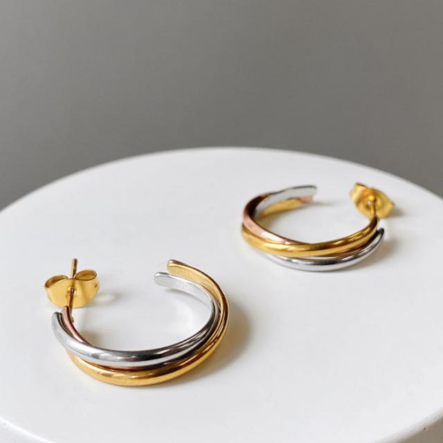 送料無料 トリニティーリングフープステンレスピアス C型 バイカラー スリーカラーミックスカラー ピアス フープピアス サージカルステンレス 金属アレルギー対応 つけっぱなし レディース シルバー ゴールド 大人 シンプル
