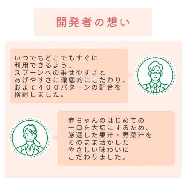 ●持ち運びしやすいスパウト付きパウチを使用し、中身はスプーンであげやすいようになめらかなペースト状に仕上げているため、いつでもどこでもお子さまに食べさせられます。