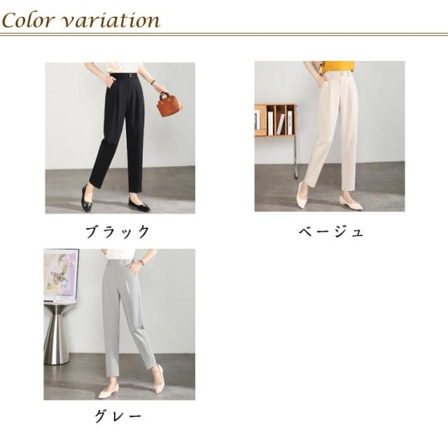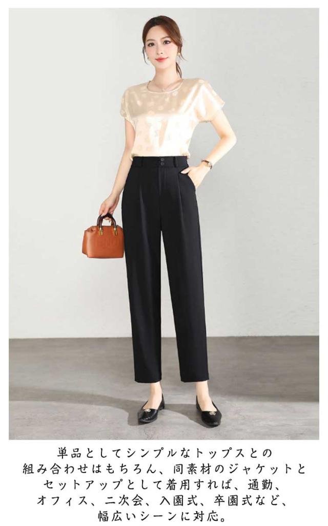 | 美しいシルエットを演出する3D設計の美脚テーパードパンツです。 センタープレスが縦のラインを強調し、細見えした美しいシルエットを実現。 後ろウエストはゴム仕様で快適なフィット感と動きやすさを実現でき、カジュアルでもキレイめでも上品で大人っぽくキマる一枚に違いないです。 しっかりとした生地で透け感もなく、シワになりにくくて嬉しいポイントです。 ハイウエストのデザインでお腹まわりをカバーしてくれて、足長い効果も作り出すスーツパンツです。 九分丈ですっきりとしたイメージを演出してくれるロングパンツです。 単品としてシンプルなトップスとの組み合わせはもちろん、同素材のジャケットとセットアップとして着用すれば、通勤、オフィス、二次会、入園式、卒園式など、幅広いシーンに対応。 長すぎてスニーカーと合わせてはカジュアル風で程よい抜け感を作れ、ローヒールパンプスと合わせては女性らしくてエレガントなイメージに。 | |