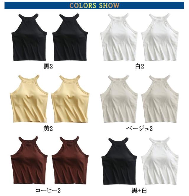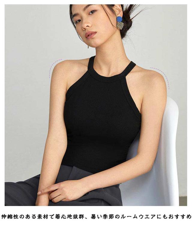 | 2枚組!肩・脇がすっきりリブホルターネックトップス。 カップ付きだからブラがいらない! シースルートップスやシャツやオフショルダーにインしてレイヤードスタイルもOK! 伸縮性のある素材で着心地抜群、暑い季節のルームウエアにもおすすめ | |