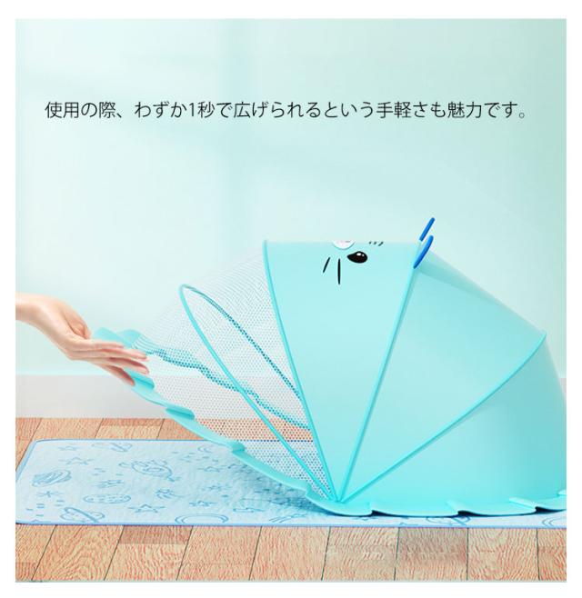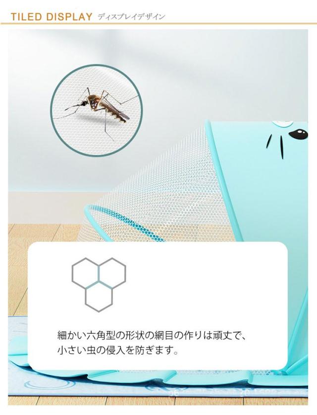 | 折り畳み式で簡単に開閉できるベビー用蚊帳。 細かい六角型の形状の網目の作りは頑丈で、小さい虫の侵入を防ぎます。 蚊帳の下部にフリルがあるので、蚊や害虫など底部分からの侵入も防ぎます。 かわいい柄のデザインもかわいいですね。 使用の際、わずか1秒で広げられるという手軽さも魅力です。 折り畳めば薄くなるため、部屋のちょっとしたすき間にも収納可能。 | |