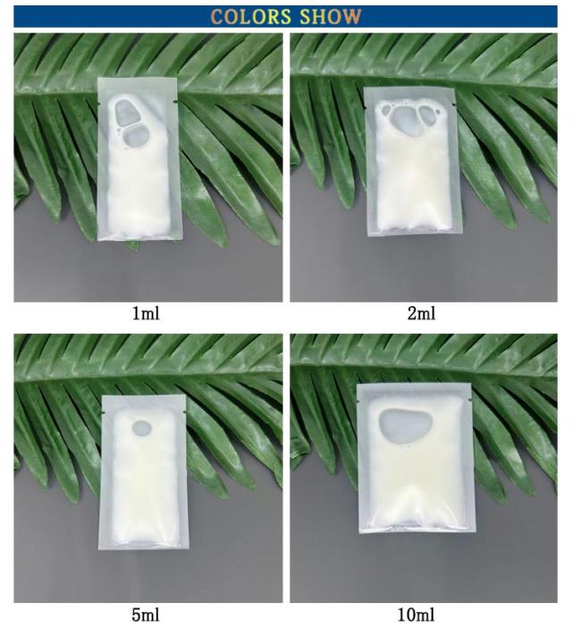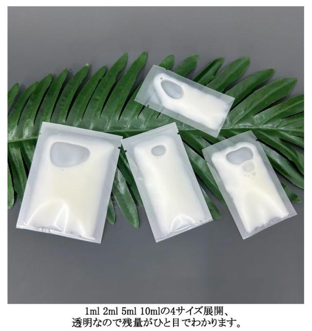 | サイズについての説明 | 【1ml】4*8cm 【2ml】5*8cm 【5ml】5*9cm 【10ml】7*9cm ※実寸はメジャー採寸の為、若干の誤差が生じる場合があります。 ※商品は開封状態で、ヒートシーラーで密封必要! |