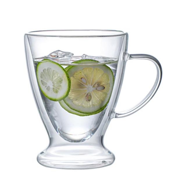 | 真空二重構造マッグカップ2個セット。 2重耐熱ガラスで作られているので熱いものは熱く、冷たいものは冷たく保つことが出来、どの季節どのシーンでも活躍します。 ハンドルつき、耐熱ガラス製マグのお洒落さはそのままに「持った時の熱さ」を解消しています。 お茶、コーヒー、ミルク、飲酒、飲料などホットでもアイスでもお楽しみ頂けます!家族と友達へのプレゼントにも特にお勧め! | |