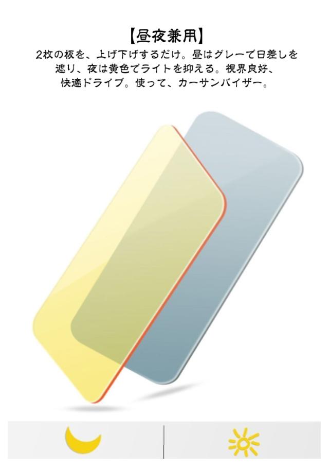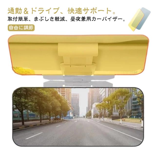 | 通勤&ドライブ、快適サポート。取付簡単、まぶしさ軽減、昼夜兼用カーバイザー。 【昼夜兼用】2枚の板を、上げ下げするだけ。昼はグレーで日差しを遮り、夜は黄色でライトを抑える。視界良好、快適ドライブ。使って、カーサンバイザー。 【クリアな視界。】偏光レンズが、ひかりをカット。日差しに、ライトに、雪面からの光の反射。あらゆるシーンで、視界を確保。使えば納得、サンバイザー。 【UVカット】紫外線から、あなたを守る。目や髪、お肌のダメージも、バイザー使用で、大幅軽減。昼間移動もな、UVカット・フロントガラスサンバイザー。 【簡単装着。】工具不要で、届いたその日に誰でも設置。 【取付け方法】01 スプリングを上に引き出します。 02 キャリパーをCDプレートに固定します。 03 昼用の黒い透明板を下ろします。 04 夜用の黄色い透明板を下ろします。 【自由に調節。】最適視界を、いつでも確保。見やすい位置に、角度を調節。不要の時は、サッとしまえる。便利なフロントサンバイザー。 【落ちない、ブレない。】取り付けは、伸縮可能なアジャスター式。日よけにぴったりフィットして、安定感をしっかり確保。落ちない、ブレない。カーフロントサンバイザー。 注意:115〜190mmの間で伸縮可能なアジャスタータイプなので、多様な車種でご利用頂けます。 | |