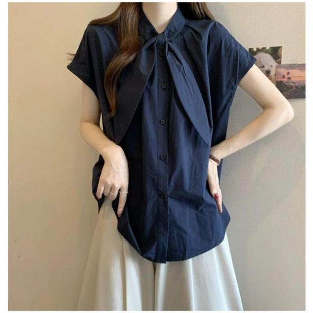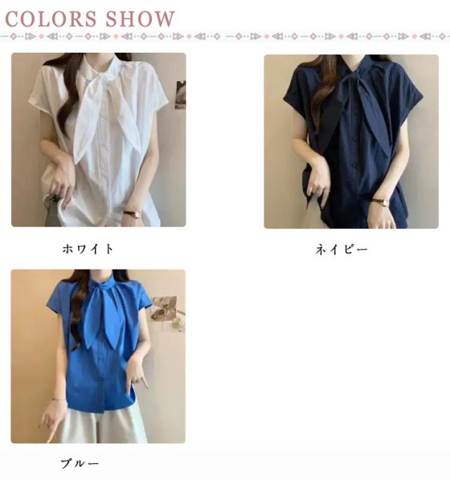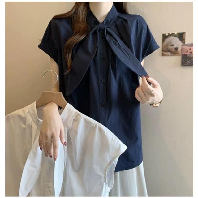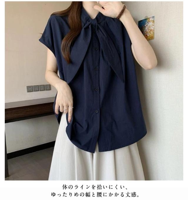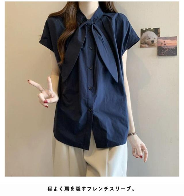 半袖 ゆったり ボウタイブラウス ブラウス スタンドカラー ボウタイブラウス レディース シャツ フレンチ袖 フレンチスリーブ 大きいサイズ シンプル 夏物 トップス 無地 韓国風 おしゃれ