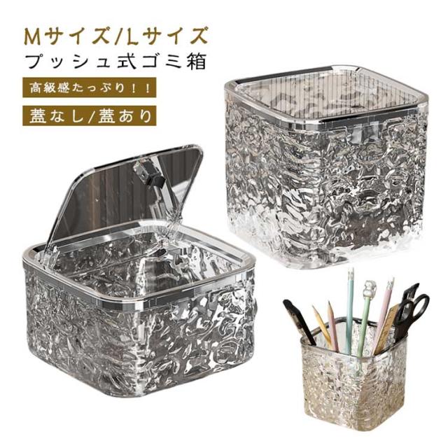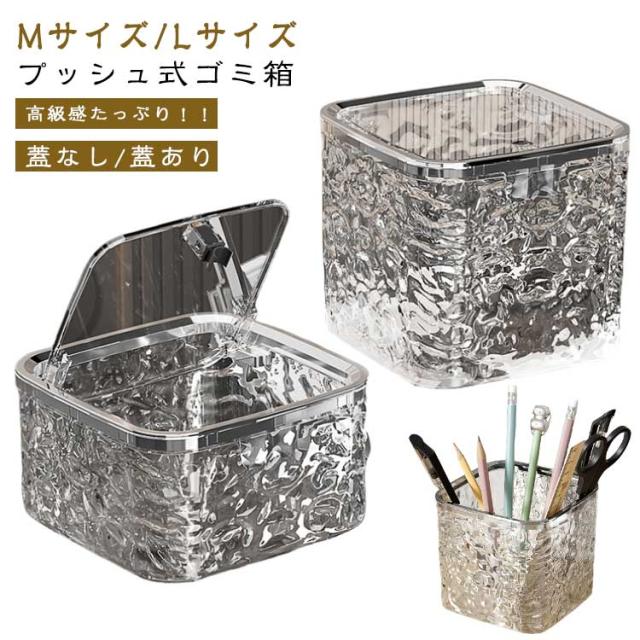 | 高級感たっぷり!! 蓋なし/蓋あり Mサイズ/Lサイズ プッシュ式ゴミ箱 ガラスのようで透明感のあるおしゃれなミニゴミ箱です! フタ付きで半透明タイプなので人の目が多いオフィスでも使いやすい♪ 他にも小物入れや収納ボックスとしてもおすすめなアイテムです◎ | |