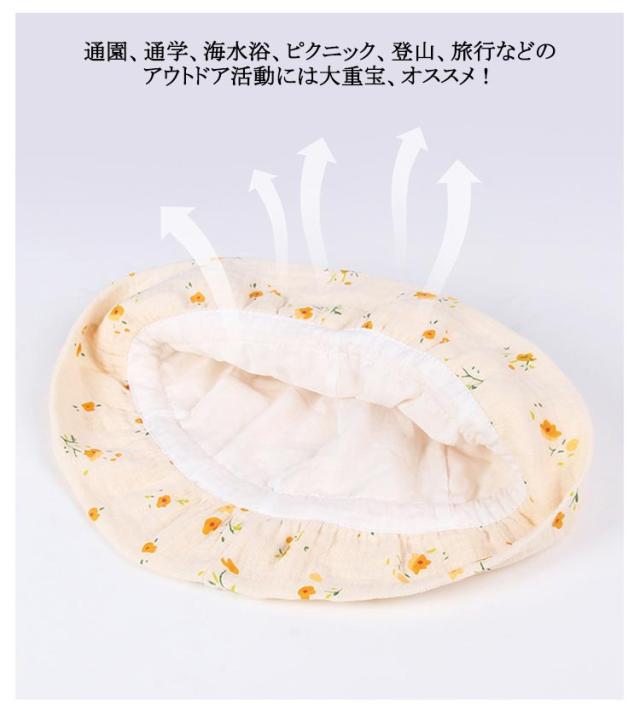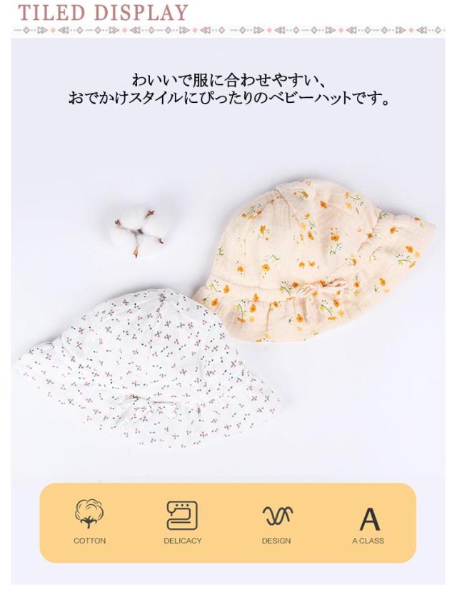 | 肌触りのよいコットン生地を採用し、柔らかくて、安心がぶって、春夏のお出かけやお散歩に最適です。 わいいで服に合わせやすい、おでかけスタイルにぴったりのベビーハットです。 小さく折りたためるので携帯にも便利です。 紐が付いていて、頭に合わせて自由に調節できます。 通園、通学、海水浴、ピクニック、登山、旅行などのアウトドア活動には大重宝、オススメ! | |