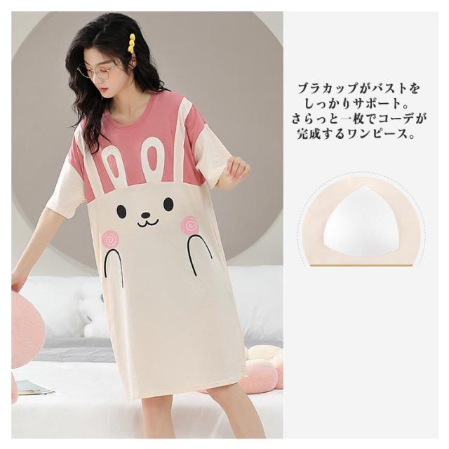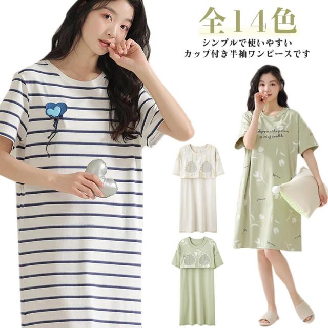 寝間着 部屋着 半袖 カップ付きワンピース ブラトップ ゆったり ロングTシャツ 半袖 パット付き ルームウェア ワンピース ワンピース 大きいサイズ パジャマ ナイトウェア 軽量 通気性 旅行用 普段着 オシャレ