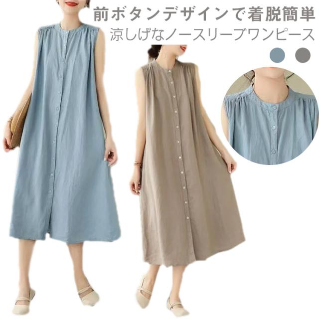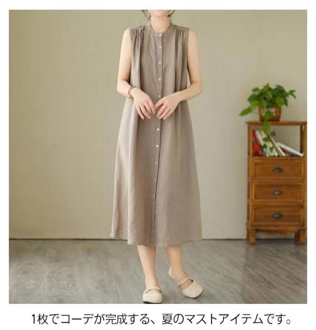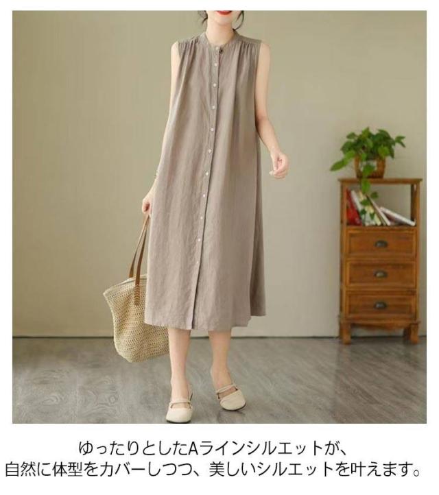 コットン混 ノースリーブ シャツワンピース ロングワンピース カジュアル 体型カバー 薄手 涼しい 無地ワンピース 夏 きれいめ シャツワンピース 前ボタン ゆったり 大人可愛い ナチュラル