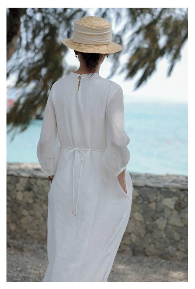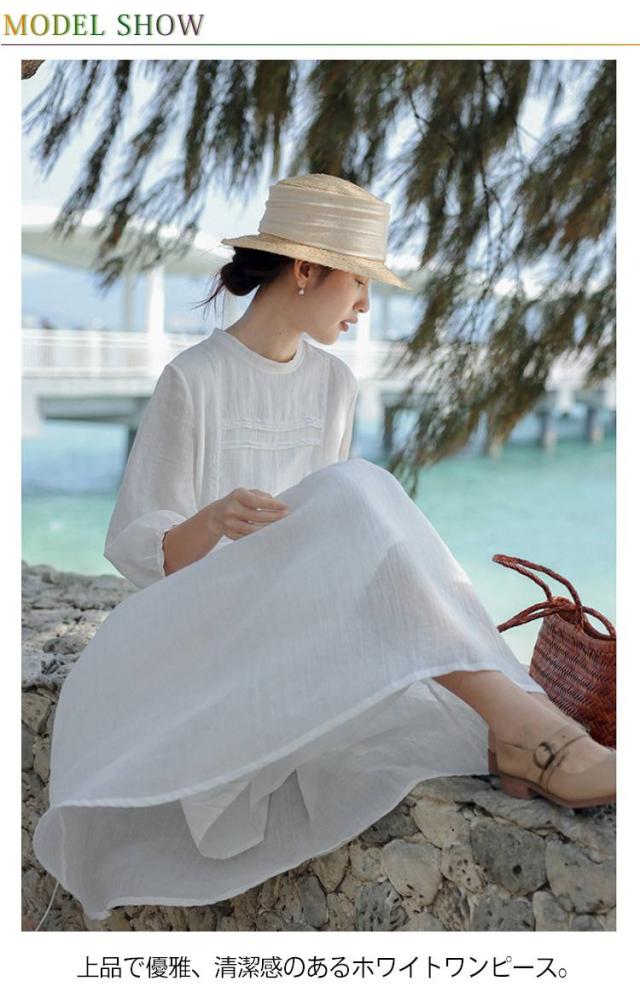 七分袖 ナチュラル ホワイトワンピース 可愛い ふんわり 白ワンピース 夏用 リネンワンピース ロングワンピース ミディアム丈 ワンピース 清楚感 ナチュラル