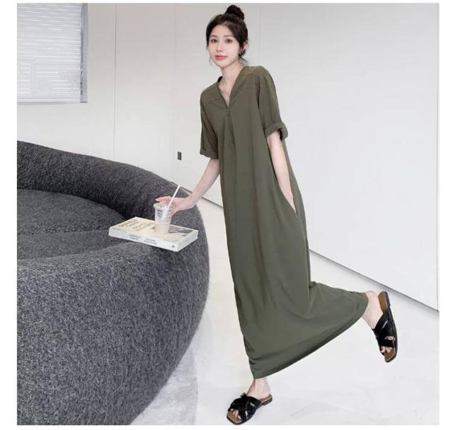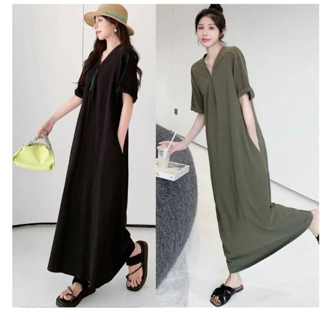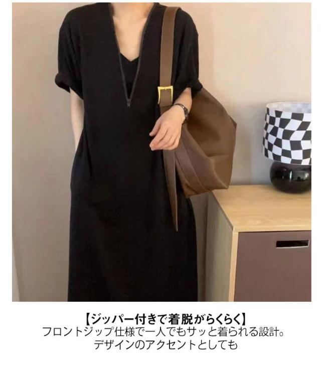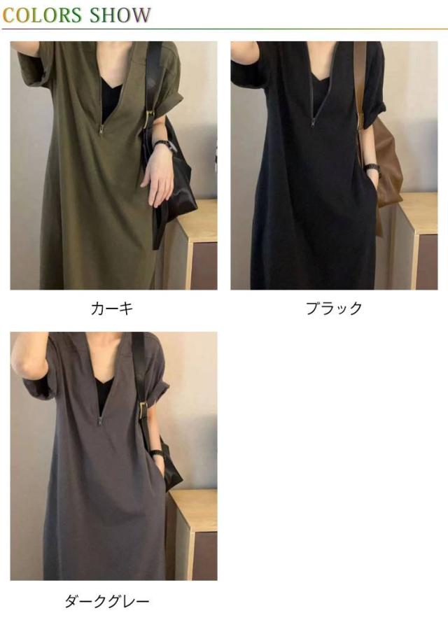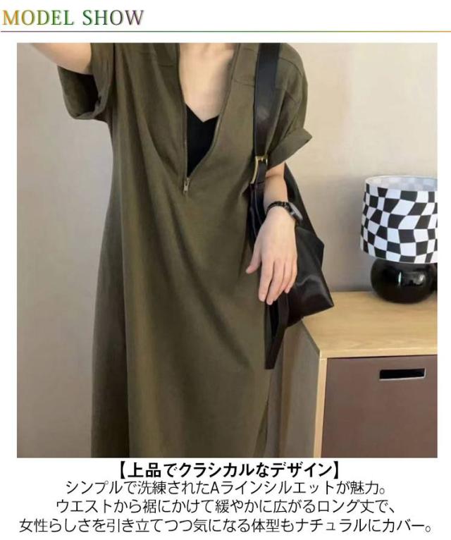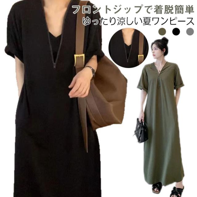 マキシワンピース フロントジップ Aラインワンピース レディース 楽ちん ワンピース ロングワンピース ロング丈 体型カバー ゆったり 半袖 夏 おしゃれ きれいめ ワンピース 着やせ カジュアル