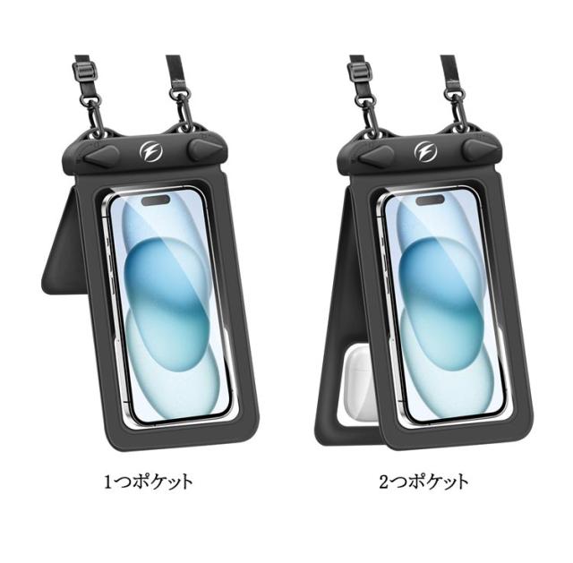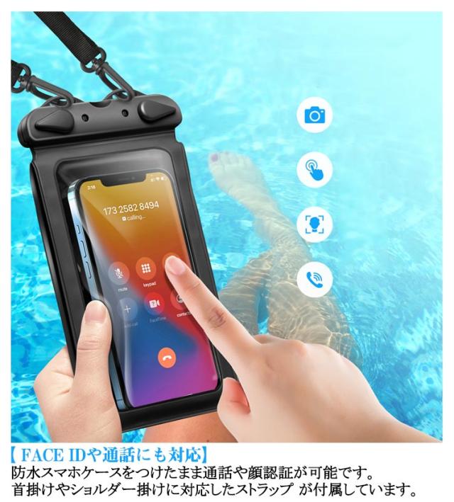| 2個セットなので、家族や友人との共有もできます。 【便利な 2way 仕様 小物収納ポケット付 】 スマホ防水ケース と 小物入れ が一体になっていて、 小銭 や コイン を同時に持ち歩けます。 コインケース としても利用可です。 【 完全防水 IPX8 】 防水等級 は最高ランクの IPX8 。 携帯防水ケース や 防水ポーチ / 携帯防水カバー / 防水バック として便利に持ち運び可能です。 【 水中 での 撮影 や 操作可能 】 プール / 海 / ダイビング / お風呂 などでも使用可能な スマホ 防水ケース です。 水に 浮く ように厚みのある 丈夫 な設計になっています。 【 FACE ID や通話にも対応】 防水 スマホケース をつけたまま通話 や 顔認証 が可能です。首掛け やショルダー 掛けに対応した ストラップ が付属しています。 【 7.5 インチまでの スマホ 対応】 で最大 6.9 インチまで対応( 使用しているスマホケースの影響あり) iPhone 13 14 15 16 Pro や各種 Android ( アンドロイド ) の端末に対応しています。 | |