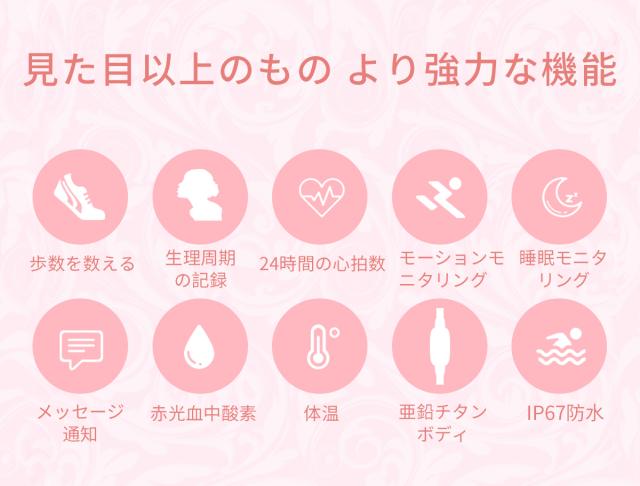 体温測定 心拍数 睡眠検測 血中酸素 女性生理管理 目覚ましアラーム 長座注意 血圧測定 心拍数 血中酸素 睡眠管理