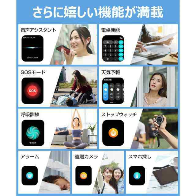 ・健康管理:体温監視、血圧測定、血糖値測定、血中酸素、心拍計、活動量計、歩数計、座りがちの自動注意、睡眠モニター、運動モニター、スポーツ、カメラ操作、カロリー、睡眠の質と時間及び日常生活のさまざまなシーンで測定ができます。