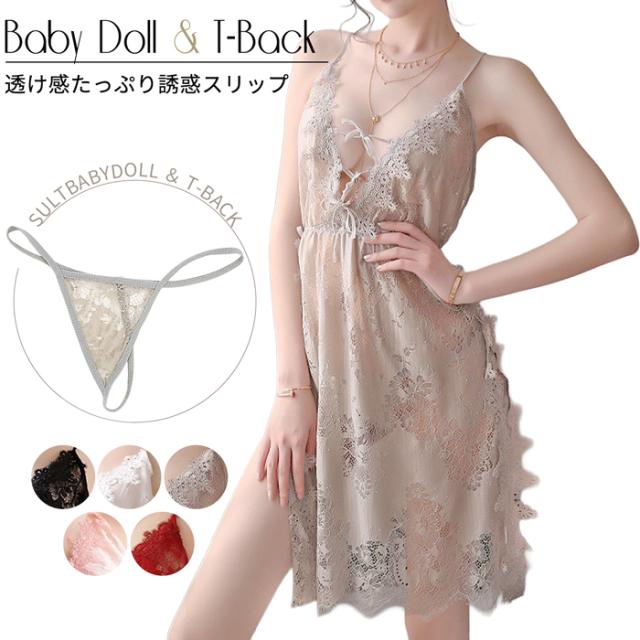 スリップ&Tバック 2点セット ベビードール 総レース ネグリジェ セクシーランジェリー スリット 透け感 コスプレ 衣装 シースルー 黒 白 赤 su-007