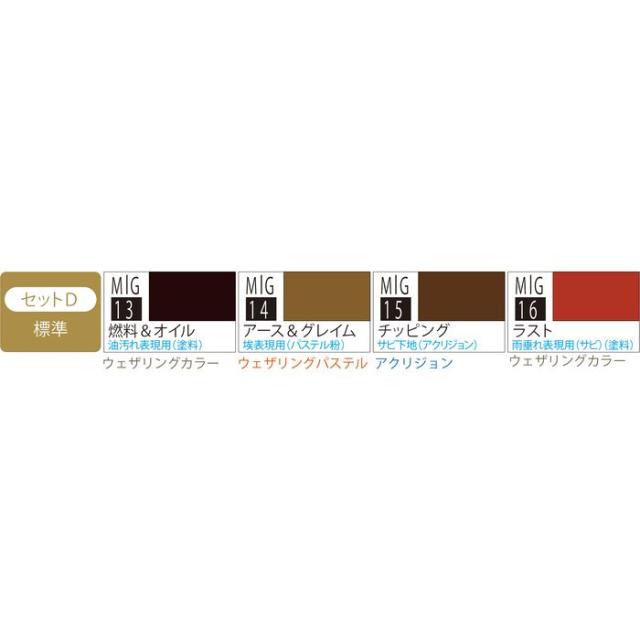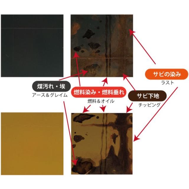 ドイツの戦車やカーゴトラックなどの鋼鉄製の車体は、運用を続けることで塗装の剥がれや、サビの浮き出し、燃料による油染みや、それらに付随した黒ずみが発生します。そのような、標準的な汚れを再現するのがこのウェザリングカラーセットです。もちろん、ドイツの車輛以外にも、時代を問わず鋼鉄製の機械類全般に使用することができる汎用的な油汚れ・サビを塗布できるカラーセットです。