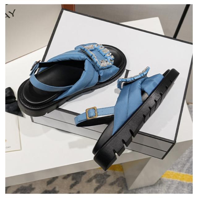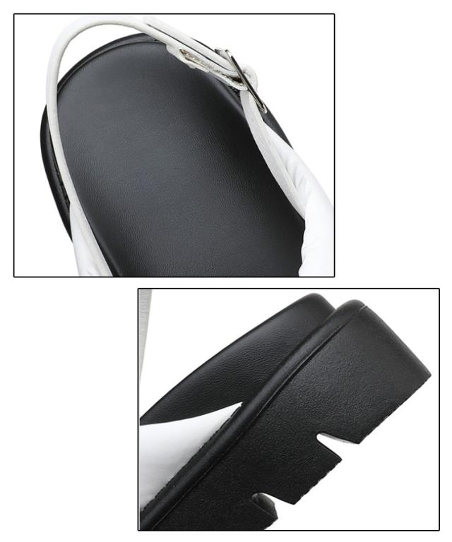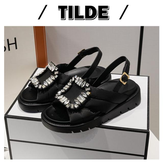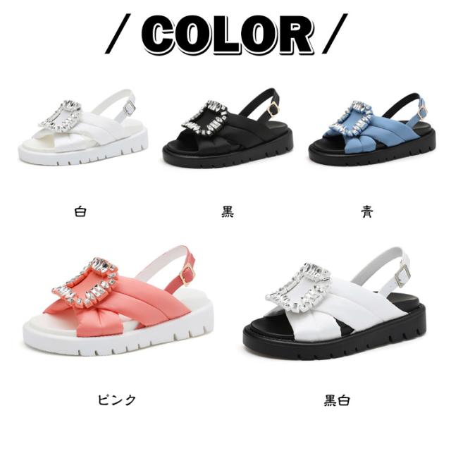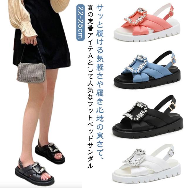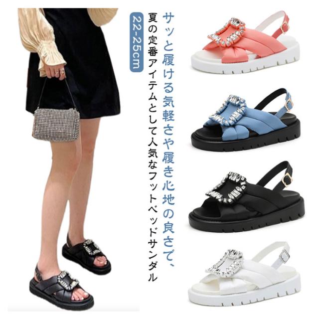 コンフォートサンダル レディース ビジュー サンダル 厚底サンダル フラットサンダル きらきら ストラップ フットベッドビジューサンダル バックル 靴 フットベッドビジューサンダル ボリュームソール バエレガント 黒 白 リシア