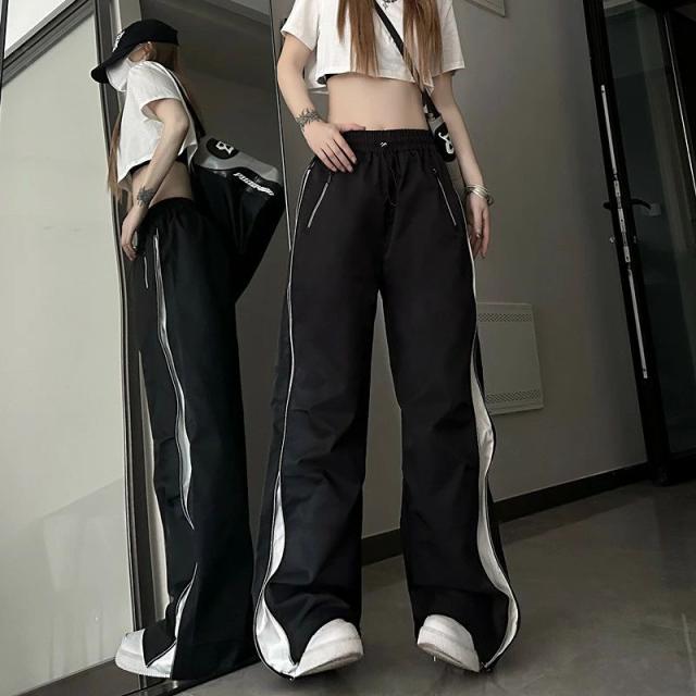 2色S~XL展開バイカラーズボンボトムスパンツブラック黒ベージュサイドジッパーゴムシンプル絞り太めダンス衣装ヒップホップHIPHOPレディースメンズガールズストリート無地大人
