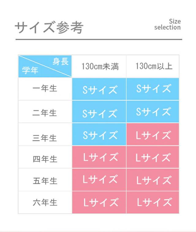 サイズ:Lサイズ(26L) 縦:46*横:30*マチ19cm(対象:4-6年生)Sサイズ(19L) 縦:41*横:29*マチ:16cm(対象:1-3年生)