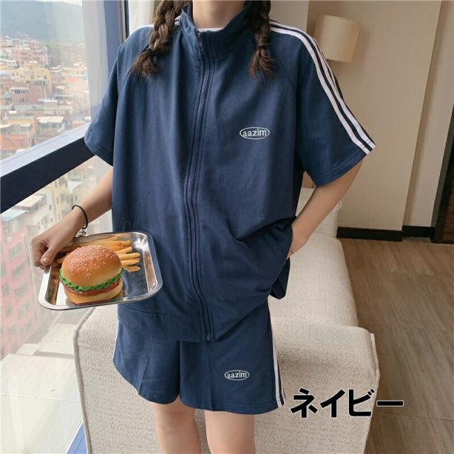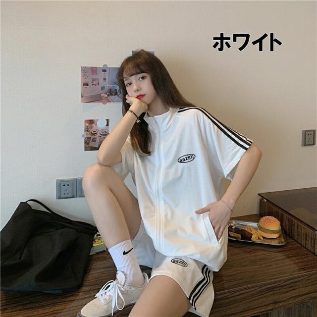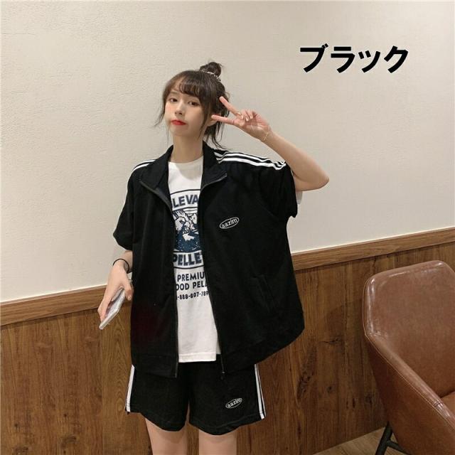 スポーティー セットアップ レディース 半袖 ジャケット ジャージ 4色 スウェット サイドライン ハイネック プルオーバー パンツ パーカー スポーツウェア エレガント春 夏 ガーリー 可愛い