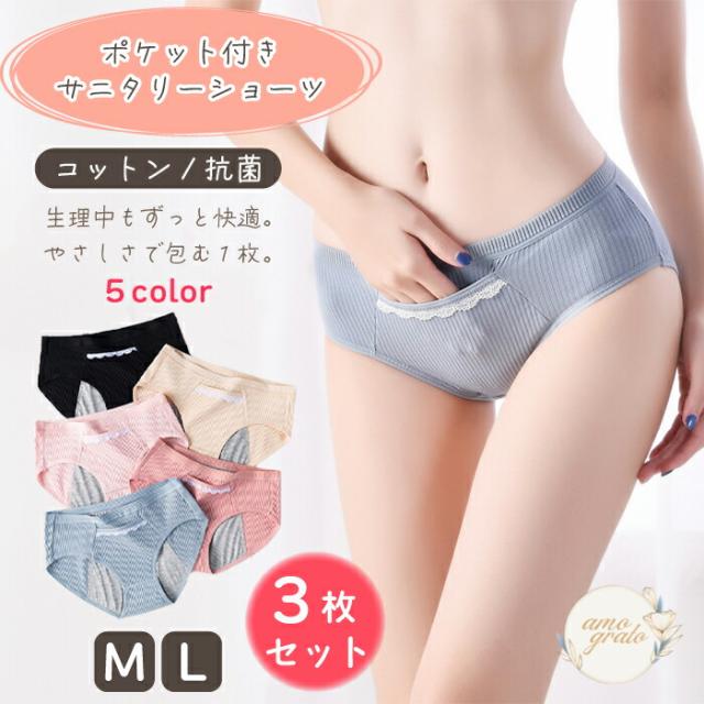 サニタリーショーツ 3枚セット 夜用 多い日 サニタリーパンツ 生理用ショーツ 生理用パンツ 生理パンツ 生理中 吸水ショーツ 生理ショーツ ポケット付きサニタリーショーツ 通気性 ポケットつき ショーツ パンツ 下着